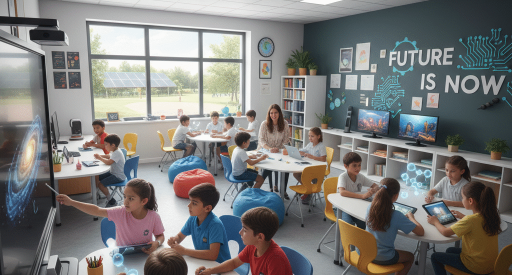 Children learn computer basics from early grades. Technology improves attention and learning outcomes. We balance screen time with outdoor play and physical activity.